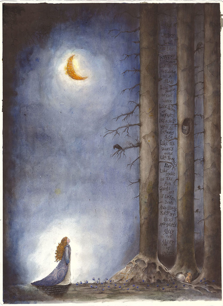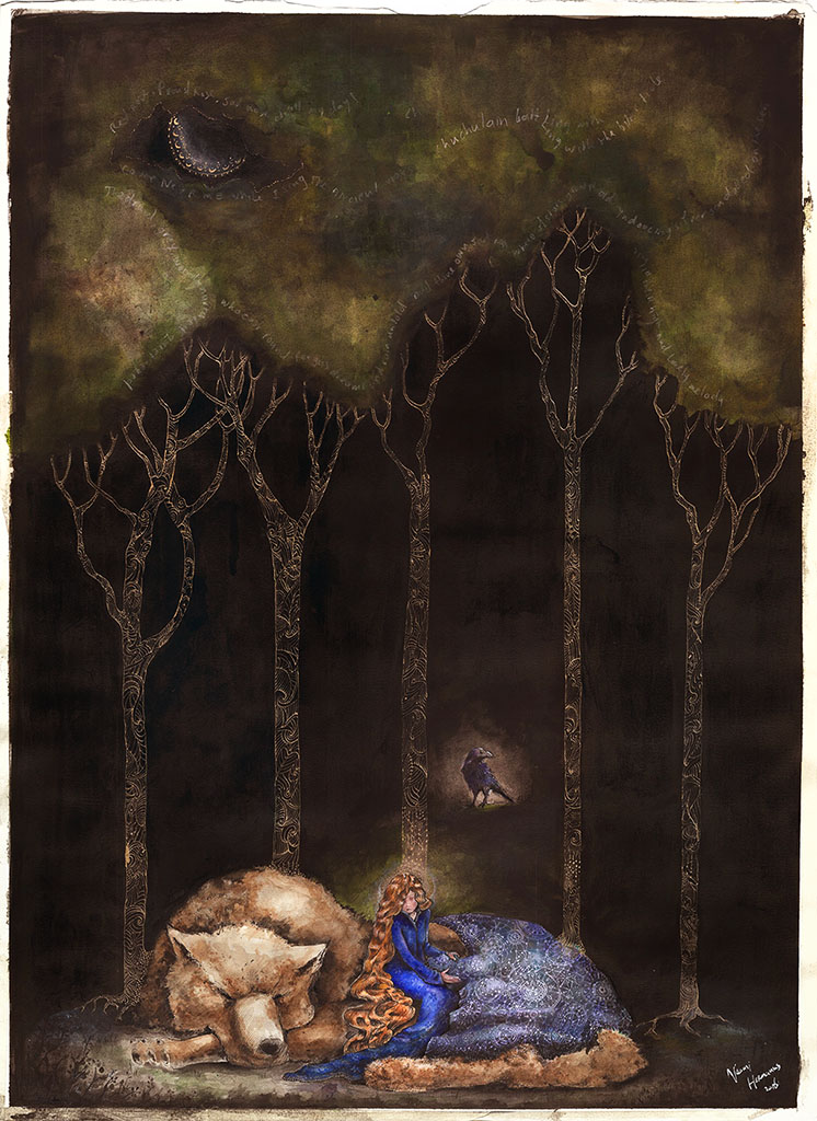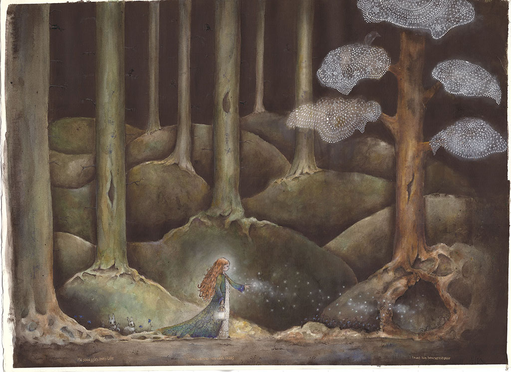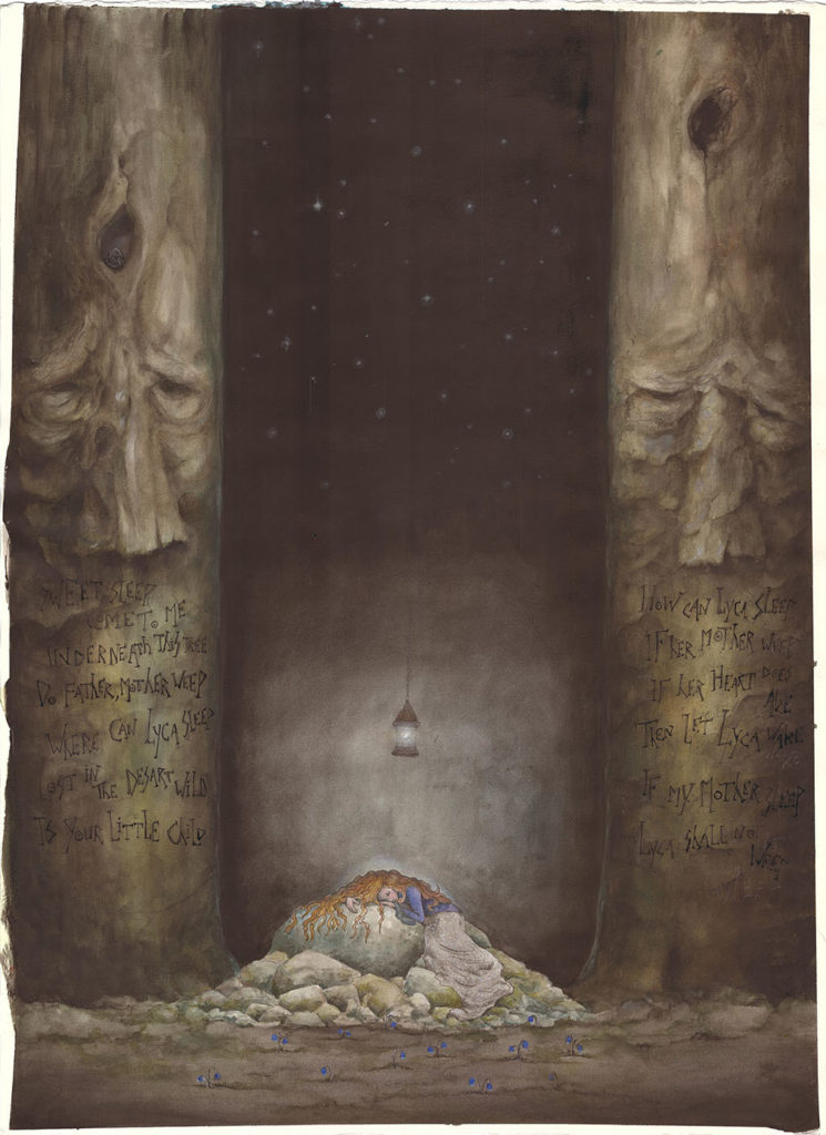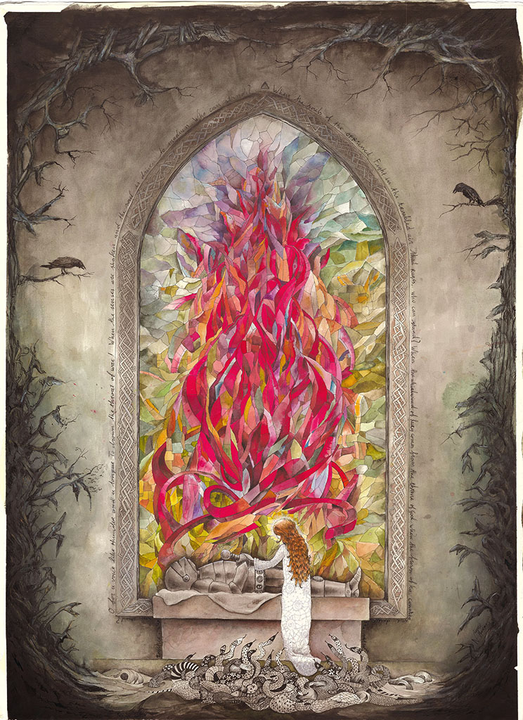 A age-old story about alchemy in the words of William Blake. The beautiful little princess goes on a journey to find her place in the world told through the processes of alchemy, the turning of led into gold. Acrylics and watercolor on cotton paper.