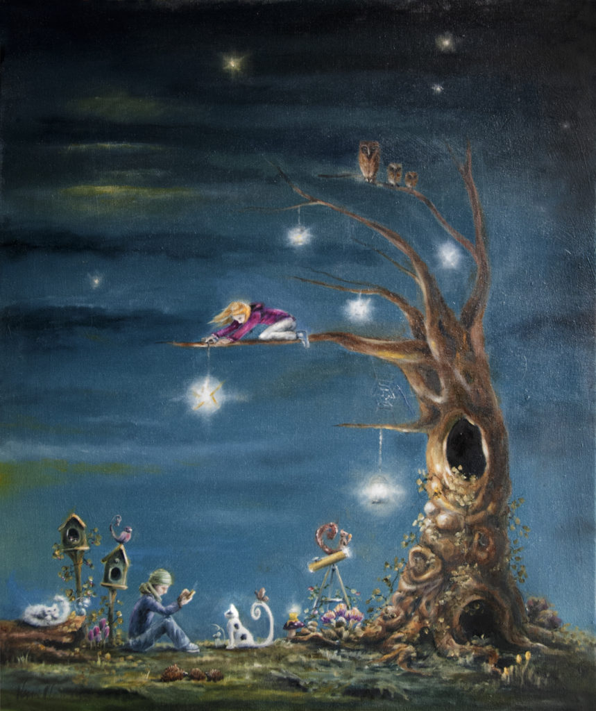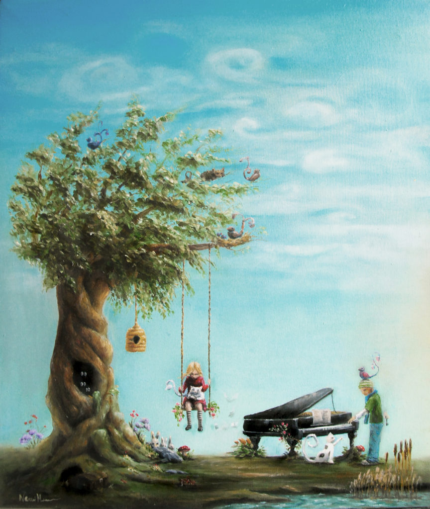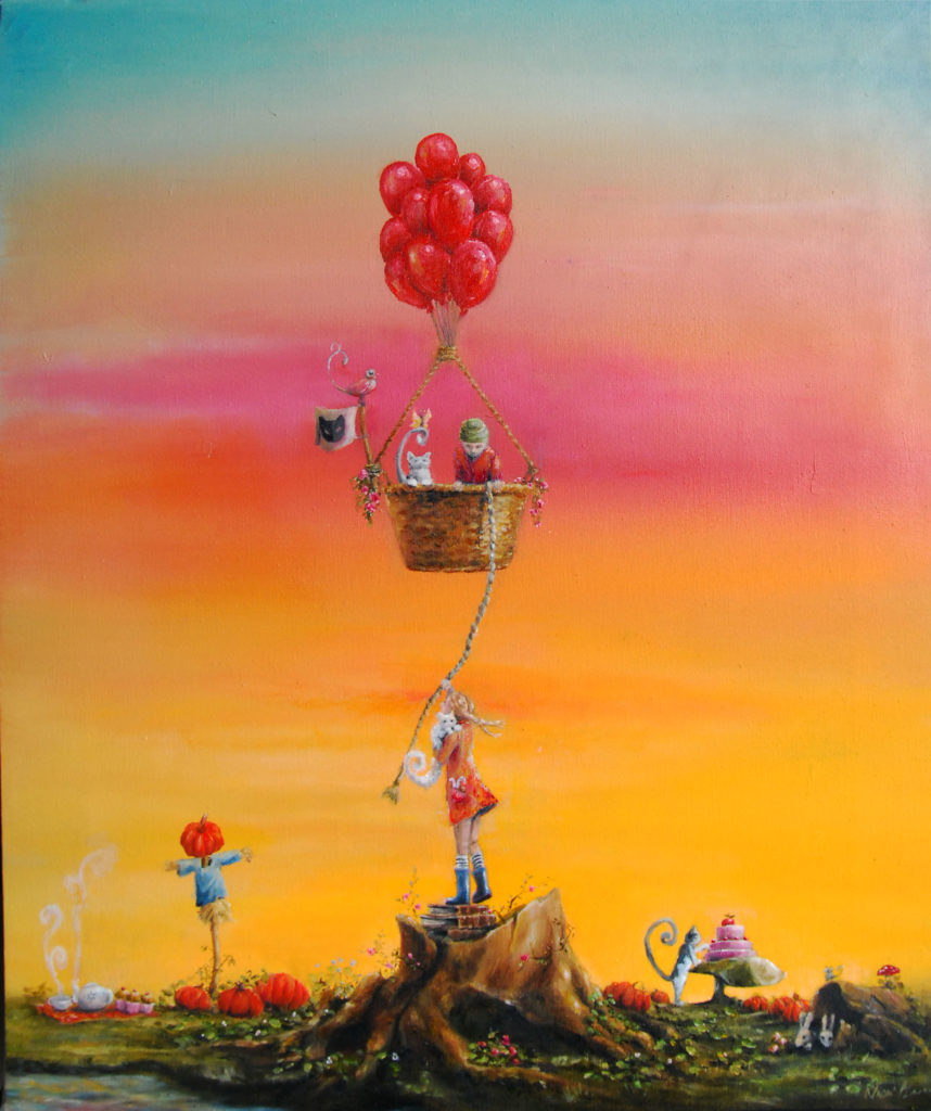 A series of happy and colorful oil paintings that are wishes for children. The twins have adventures all day and are still not sleepy one bit!
