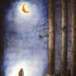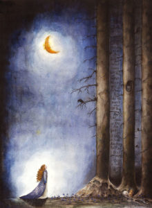 Acrylics, watercolor and ink on cotton paper. The story of the princes and the alchemy of the soul. Mercury, the element above all elements, the reflection of the sun in a bowl. Our princess talks to her raven friend before she enters the dark forest.