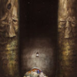 Acrylics, watercolor and ink on cotton paper. The story of the princes and the alchemy of the soul. She is laying on the ground, lost and sad. Her red hair draped onto the stone as a blanket. The trees are singing her a lullaby, sweet words to make her forget. A light is shining on her. The blue flower of forgetfulness. The tempering of the substance is what transforms the substance to the next stage.